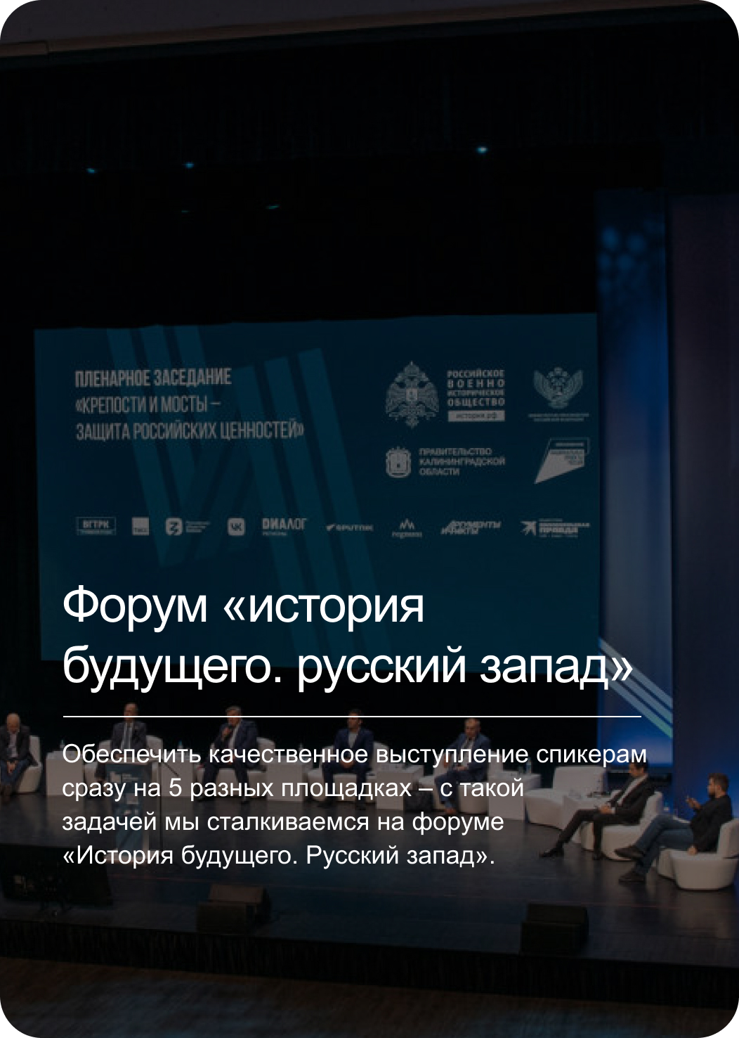 Обеспечить качественное выступление спикерам сразу на 5 разных площадках – с такой задачей мы сталкиваемся на форуме «История будущего. Русский запад».